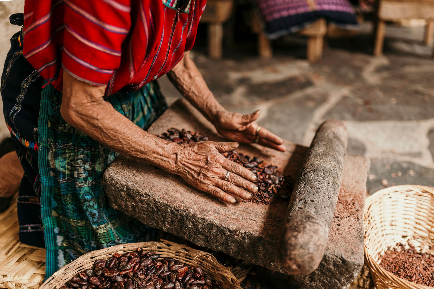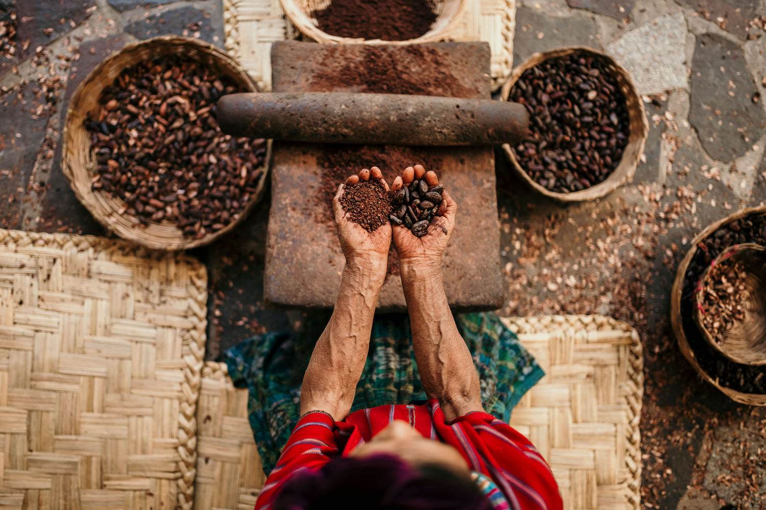 Ceremonial cacao is made using traditional methods. Cacao pods are harvested, fermented, sun-dried, and hand-roasted to preserve their nutrients and natural flavors. The beans are then stone-ground into a rich paste without additives or processing.
